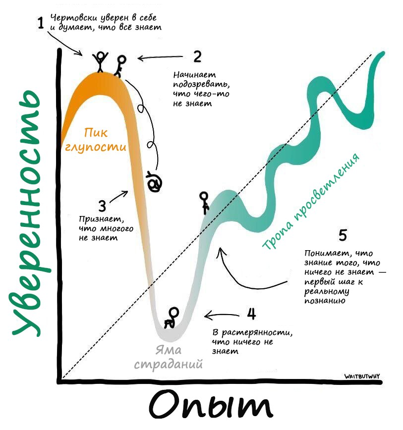 Я без ума от этой картинки, которую стащил с сайта https://waitbutwhy.com и перевёл. Это прям карта, которая показывает, как меняется уверенность человека при движении к цели. Хоть в оригинале говорится о квалификации людей, об их профессионализме, на самом деле она про достижение цели.
